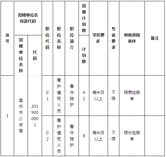 盤州市公安局2019年面向社會公開招聘留置場所編外合同制看護人員計劃職位一覽表