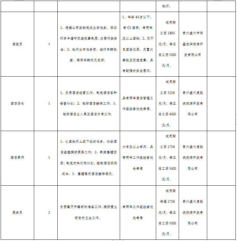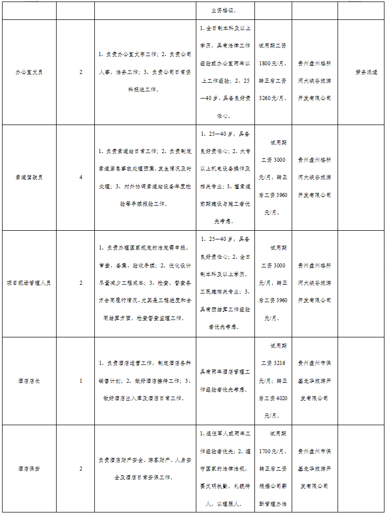 招聘辦公室文員、法律專業文員、運營專員、索道駕駛員、工程現場管理、酒店店長、酒店廚師、服務員、酒店保安、駕駛員等崗位20人,詳見附件1《貴州力搏人力資源服務有限公司招聘崗位需求表》。