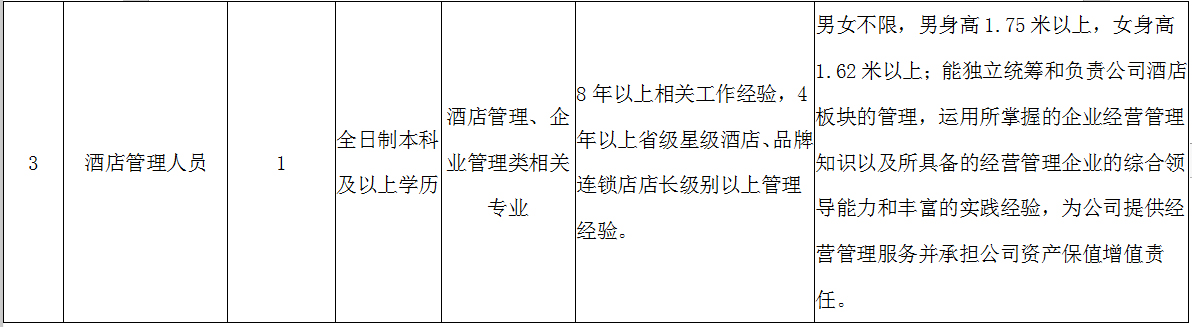 營銷管理人員1名、景區管理人員1名、酒店管理人員1名、建筑管理人員1名,詳情見附件2。