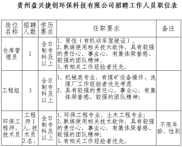 貴州盤興捷創(chuàng)環(huán)保科技有限公司2019年面向社會公開招聘倉庫管理員1名,技術(shù)工程師1名,技術(shù)員2名,工程組3名。具體招聘職位詳見附件1《貴州盤興捷創(chuàng)環(huán)保科技有限公司招聘工作人員職位表》。